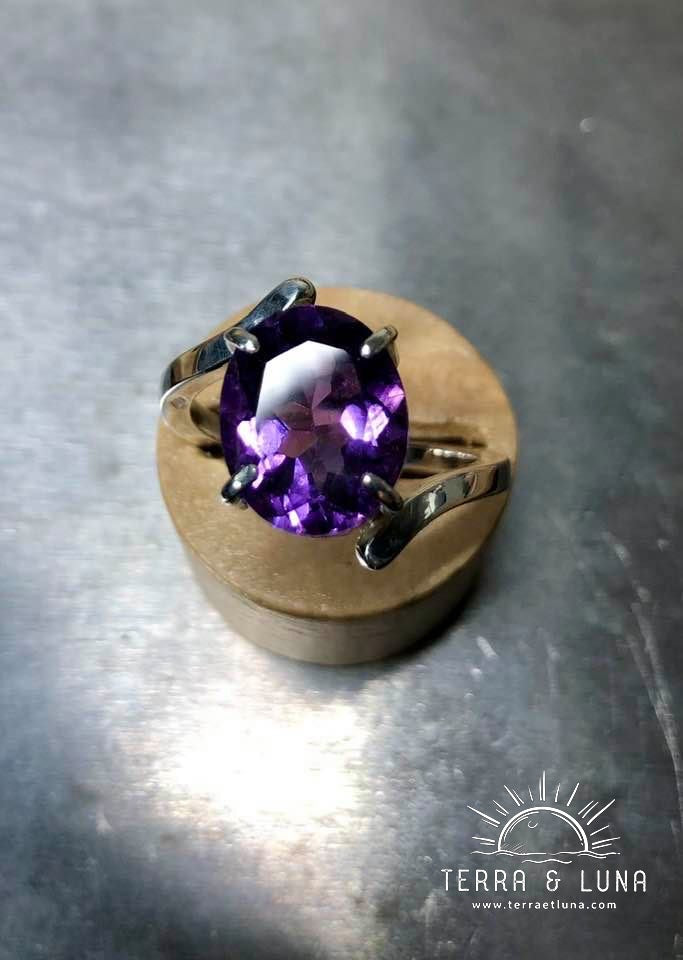 Bague asymétrique composée d'une Améthyste naturelle du Brésil, coupe ovale facettée et serti griffes sur bague en argent massif 925/000.