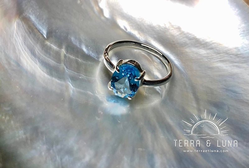 Bague Topaze naturelle bleue Suisse coupe ovale montée en serti griffe sur anneau demi jonc argent massif.
