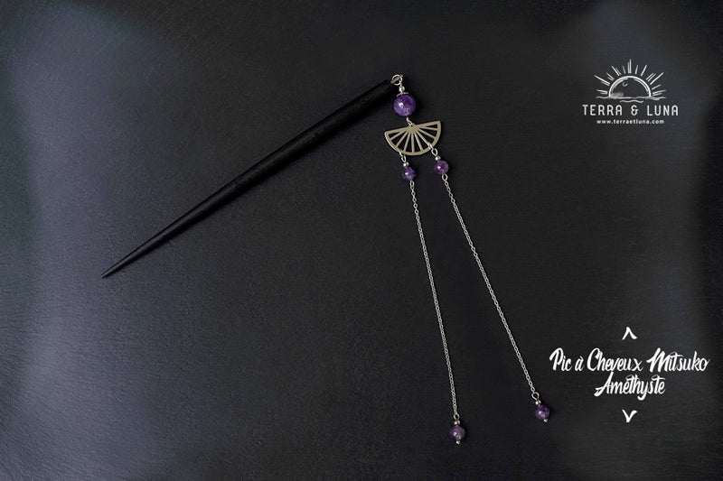 Pic à cheveux Mitsuko en bois noir et perles d'Améthyste naturelles
