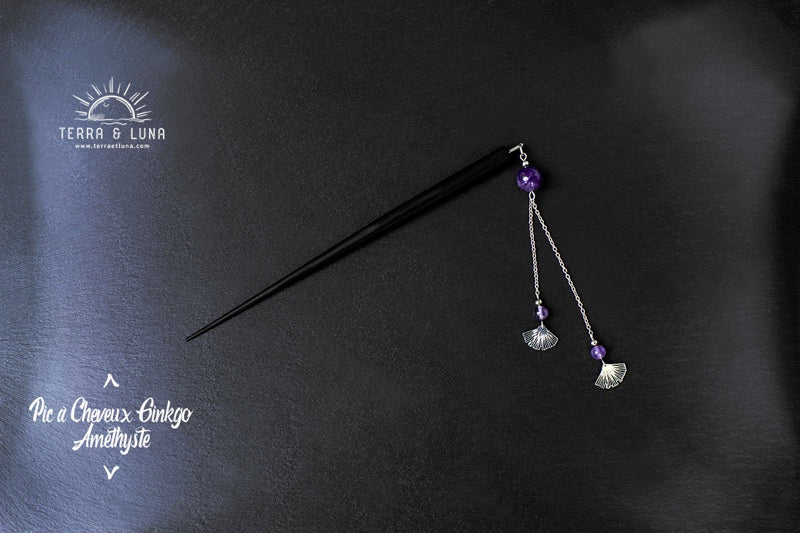 Pic à cheveux Gingko, d'inspiration Japonaise, crée sur support bois noir exotique avec des perles naturelles d'Améthyste 6 et 10mm.